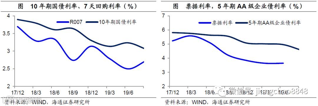 市场利率大幅下降。观察中国的各类利率走势,在18年以来都有下降,但是降幅却大不相同。其中相对市场化的利率,降幅都在100bp左右,包括货币市场7天回购利率R007,债券市场10年期国债利率,5年期AA级企业债利率,以及贷款利率中的票据融资利率。