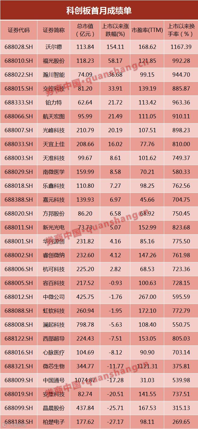 截至8月21日收盘,28只股票的平均涨幅为10.29%(以首日开盘价计算),共有17只股票实现上涨,11只股票下跌。其中,涨幅最大的股票为沃尔德,涨幅达154%。成交方面,28只股票一个月累计成交5837亿元。