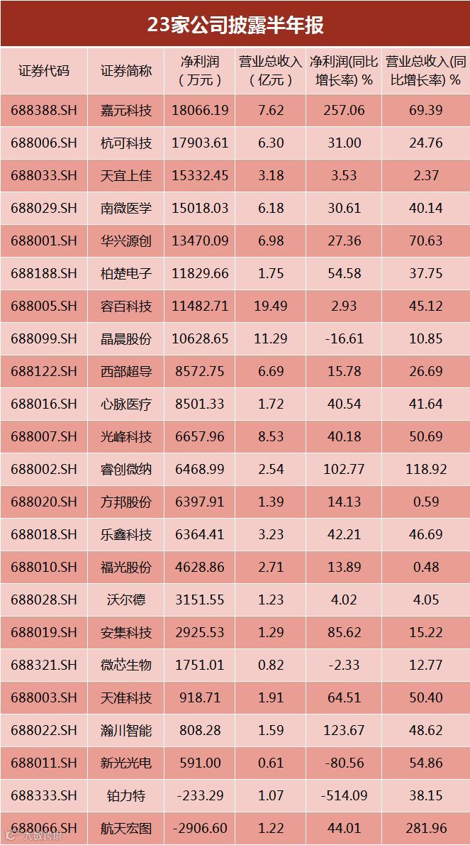 此外,23家公司共盈利16.83亿元,嘉元科技、杭可科技、天宜上佳、南微医学、华兴源创、柏楚电子、容百科技、晶晨股份等8家公司的净利润均超过1亿元,其中嘉元科技是目前披露的科创板企业净利最高的一家,达1.8亿元。