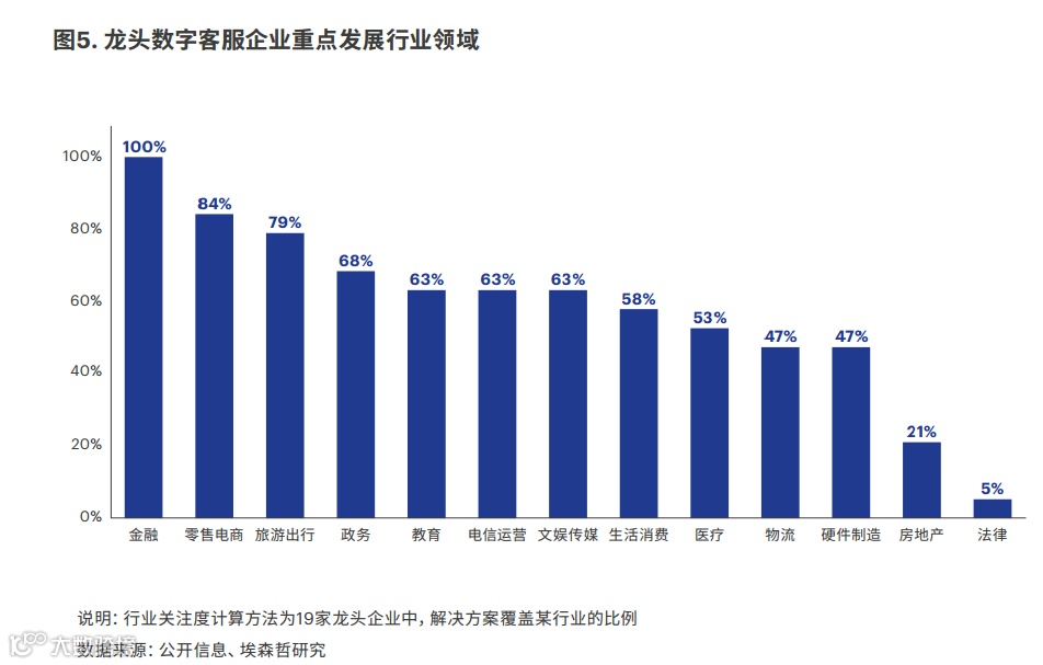 “截至2018年12月31日,国内至少有73家提供数字客服解决方案的企业获得融资,” 腾涛介绍,在应用行业里,金融、零售电商、旅游出行、政务成为了智能客服的重点领域,而其中金融行业的关注度最高;对19家提供数字客服解决方案的企业(包括获得B轮到E轮融资、新三板和已上市企业)的主攻行业进行分析,发现其中六成以上的企业方案涉及金融、零售电商、旅游出行、政务、教育、电信运营及文娱传媒这七大行业。