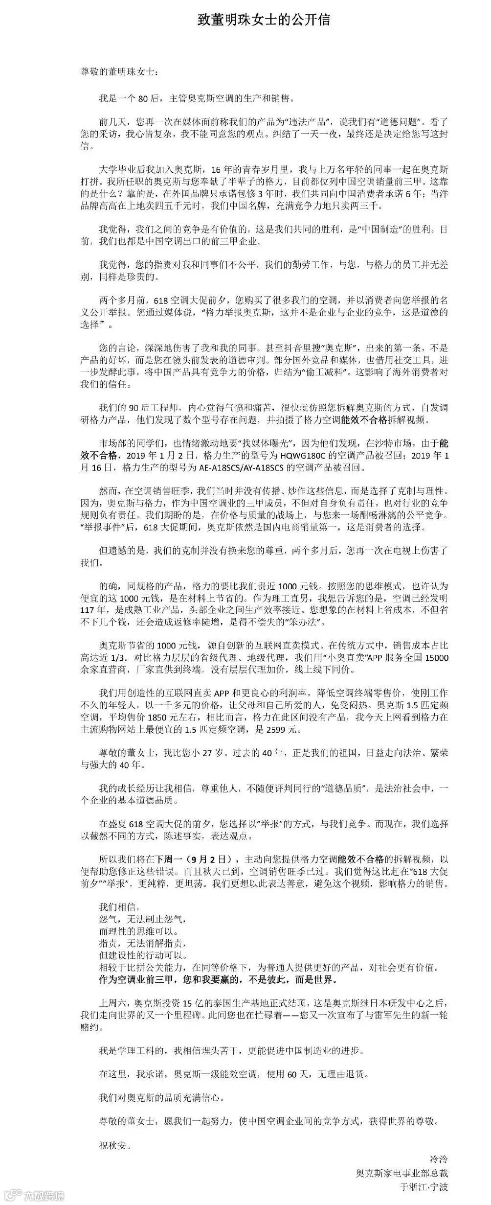 8月30日下午消息,格力和奥克斯互掐事件持续升级,今日,奥克斯家电事业部总裁冷冷在微博上发布了一封《致董明珠女士的公开信》,向董明珠喊话称:“您选择‘举报’的方式,与我们竞争。而现在,我们选择截然不同的方式,陈述事实,表达观点。所以我们将在下周一(9月2日),主动向您提供格力空调能效不合格的拆解视频,以便帮助您修正这些错误。”