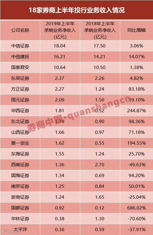 此前,证券业协会下发给券商的上半年业绩情况显示,按单家公司口径,中信建投上半年投行业务净收入15.80亿元,排名第一;中信证券投行业务收入15.28亿元,排名第二;海通证券、中金公司、光大证券位列第三至第五,上半年投行业务净收入均超过7.8亿元。