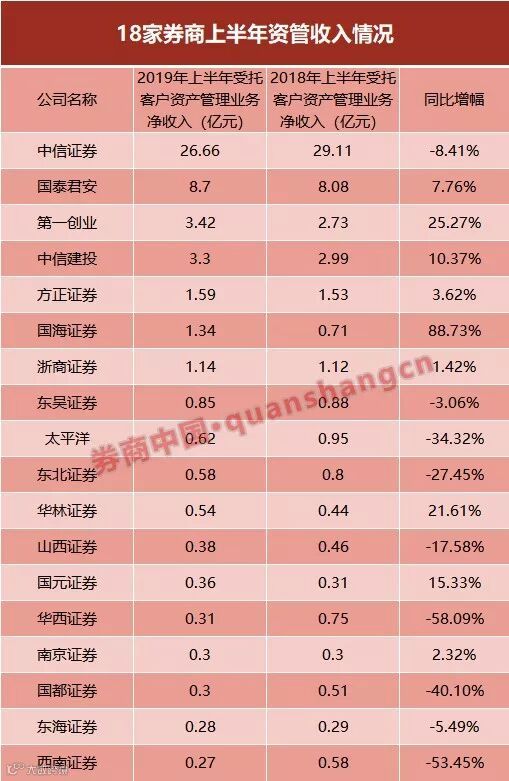 例如,华西证券半年报显示,2019年以来,资产管理行业监管新规给行业带来的影响持续,全行业业务规模进一步缩减,资产管理行业面临回归主动管理的转型压力。太平洋也指出,报告期内受资管新规和结构性去杠杆影响,公司有序压降通道业务管理规模,资产管理手续费净收入下降。