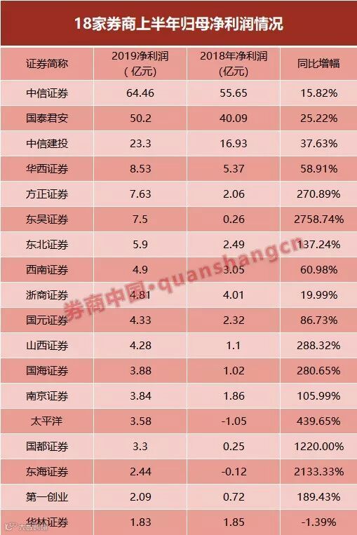 从净利润数据来看,在目前公布半年报的18家券商中,中信证券仍然高举榜首,其在2019年上半年实现净利润64.46亿元,同比增长15.82%。国泰君安当期实现净利润50.20亿元,同比增长25.22%,暂据第二位。