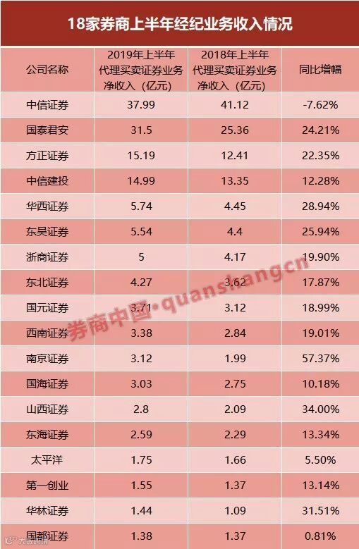 就目前数据来看,中信证券上半年代理买卖证券业务净收入为37.99亿元,同样居于首位,但较公司自身而言,却有7.62%的微降。此外,其余17家券商代理买卖证券业务净收入同比全部上升,7家增幅超过20%,跑赢行业平均水平。其中,南京证券同比增幅达到57.37%,增幅接近六成,在18家券商中同比增幅最高。