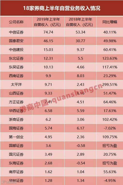 中信证券自营收入超70亿元,同比增幅超40%;国泰君安上半年自营收入超46亿,同比增幅近50%;中信建投15.03亿元的自营收入同比增60%;太平洋、东北证券、浙商证券、东吴证券自营收入同比增幅均超100%。
