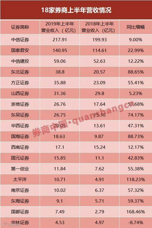 另外,18家券商中仅有华林证券营收水平不及去年同期,同比下降8.74%,主要系投行业务和信用业务营收同比下降所致。