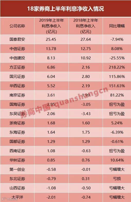 目前券商披露的中报情况,国泰君安上半年利息净收入25.45亿元,排名第一,同比下滑7.94%;中信证券上半年利息净收入13.78亿元,同比增8.08%;方正证券和国元证券的利息净收入均超6亿元,同比增幅超100%。