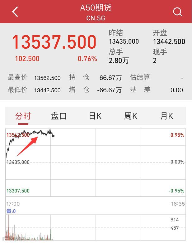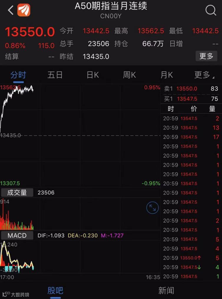 其次,从A50的走势来看,亦出现了大幅拉升的情况。