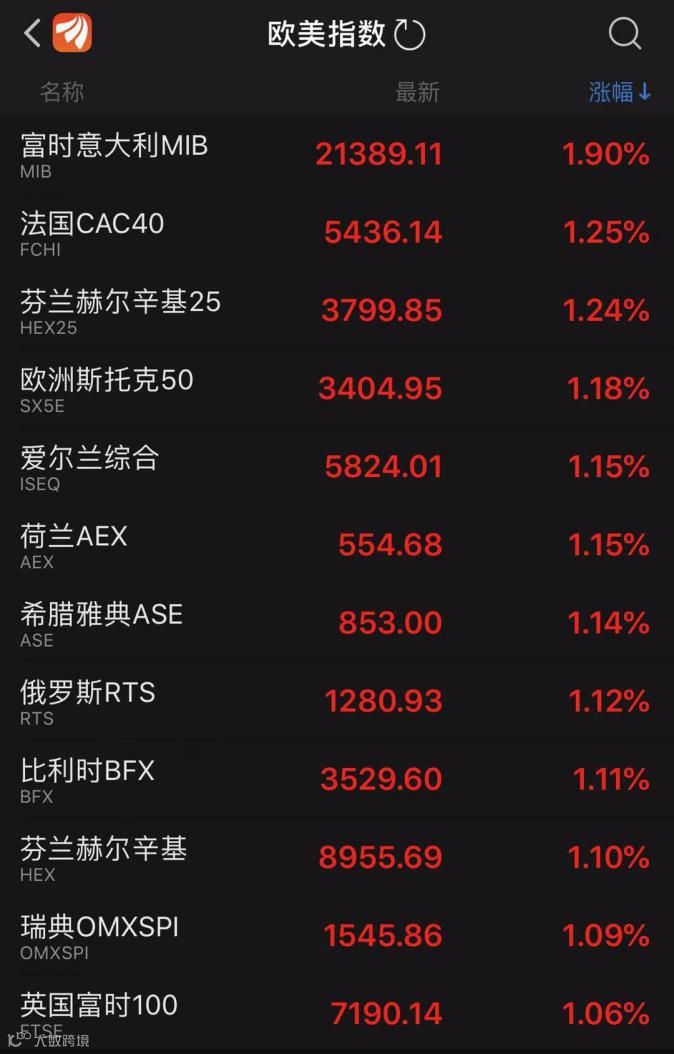 受超预期“成绩单”刺激,欧洲股市大幅飙升,其中意大利股市最多时,涨幅超过2%。