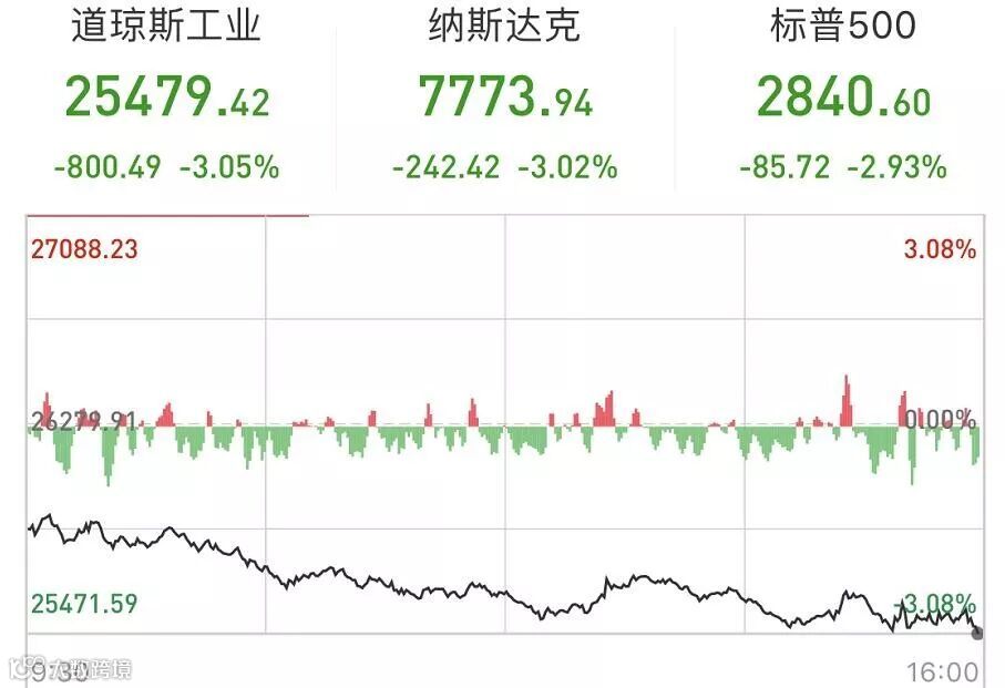 全球国债收益率狂跌,美国债收益率曲线期限倒挂引发经济衰退担忧,美股昨晚大幅收跌,道指跌逾800点,创年内最大单日跌幅。截至收盘,道指跌3.05%报25479.42点,标普500跌2.93%报2840.6点,纳指跌3.02%报7773.94点,美股市值单日蒸发再度超过1万亿美元。