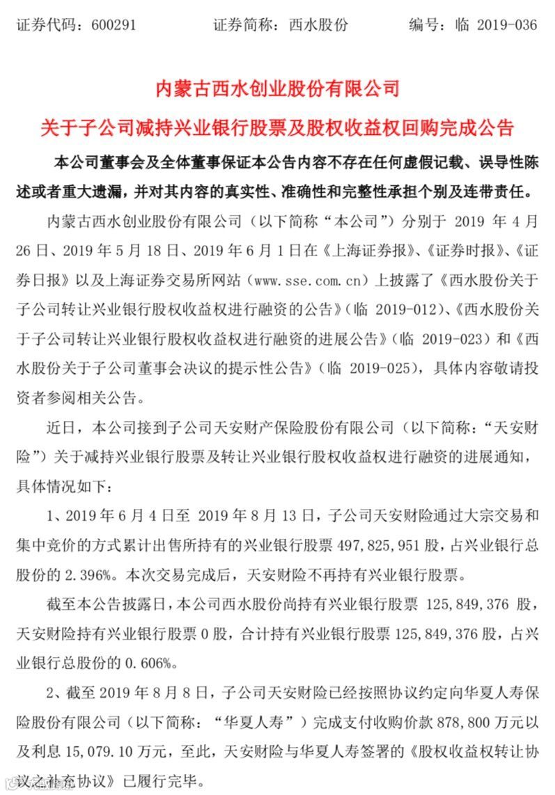 西水股份昨日晚间公告称,2019年6月4日至2019年8月13日,子公司天安财险通过大宗交易和集中竞价方式累计出售所持有的兴业银行股票4.98亿股,占兴业银行总股份的2.396%。本次交易完成后,天安财险不再持有兴业银行股票。