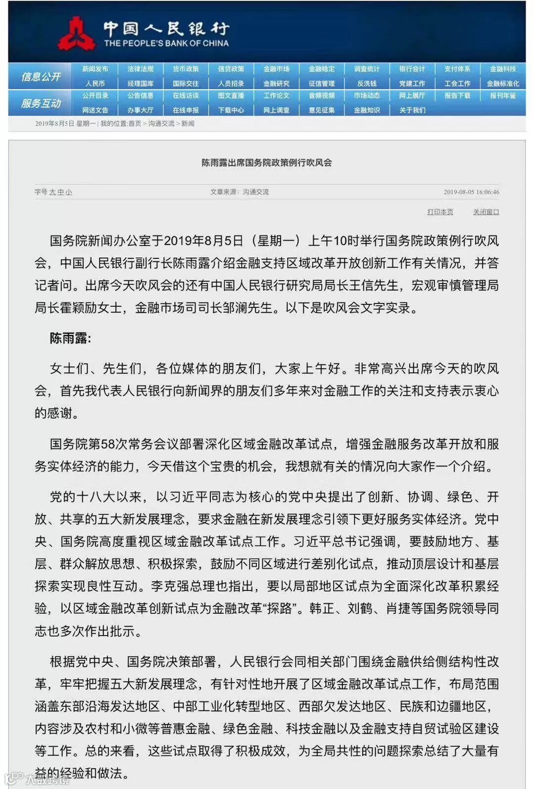 国务院新闻办公室于8月5日(星期一)上午举行国务院政策例行吹风会,人民银行副行长陈雨露介绍金融支持区域改革开放创新工作有关情况,并答记者问。出席今天吹风会的还有央行研究局局长王信,宏观审慎管理局局长霍颖励,金融市场司司长邹澜。
