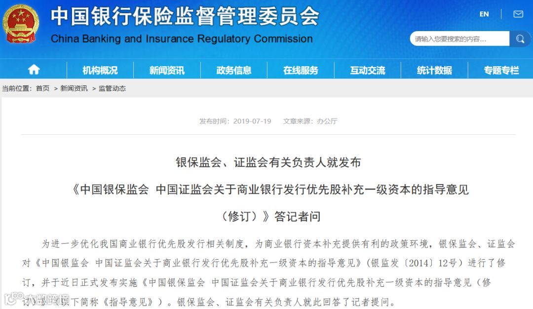 7月19日,为进一步疏通商业银行资本补充渠道,促进商业银行提升资本充足水平,增加信贷投放空间,更好地支持实体经济发展,银保监会、证监会对《中国银监会 中国证监会关于商业银行发行优先股补充一级资本的指导意见》(银监发〔2014〕12号)进行了修订,并正式发布实施《中国银保监会 中国证监会关于商业银行发行优先股补充一级资本的指导意见(修订)》。