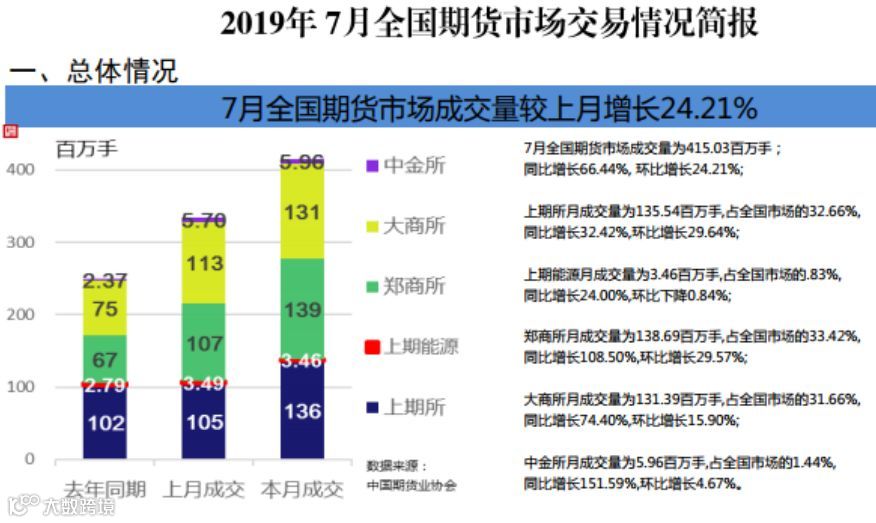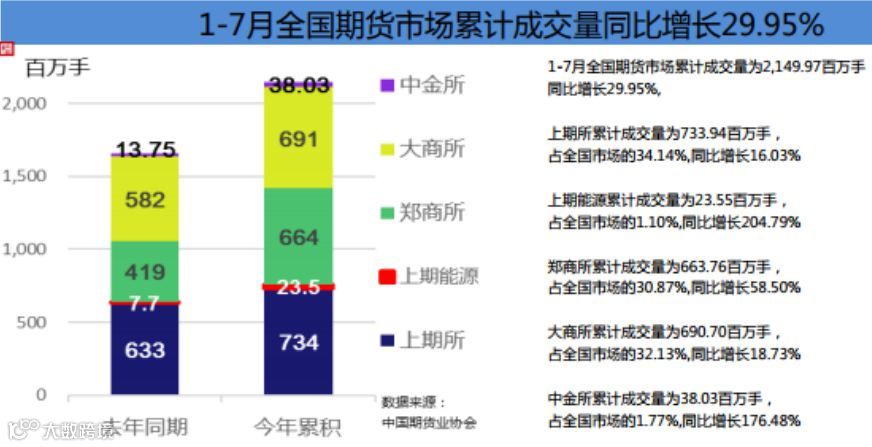 此外,伴随期货服务实体经济的逐步显效,国内期货市场的交易情况也有所提升。中期协数据显示,今年7月全国期货市场成交量为415.03百万手,较6月环比增长24.21%,同比增长66.44%;今年1-7月全国期货市场累计成交量同比增长29.95%。