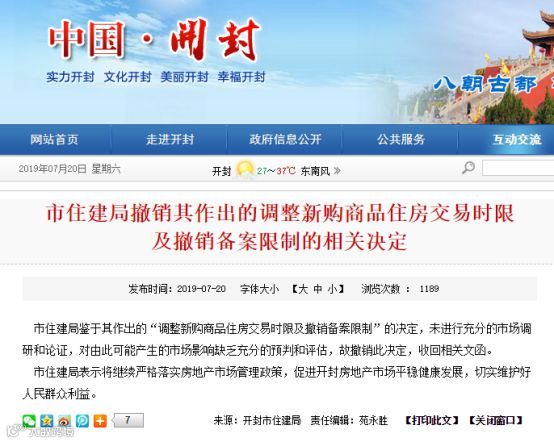 7月20日,开封政府网挂出一则通知公告,即市住建局撤销其所作出的调整新购商品住房交易时限及撤销备案限制的相关决定。