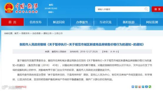 2018年12月27日,衡阳市政府发通知称,鉴于衡阳市发展改革委员会、衡阳市住房和城乡建设局联合印发的《关于暂停执行<关于规范市城区新建商品房销售价格行为的通知>的通知》,对稳控房价的复杂性判断不精准,对稳定预期的持续性认识不充分,文件出台引发了市场的误解和网上的炒作,其影响有悖于部门出台文件的初衷,衡阳市人民政府决定撤销该文件。