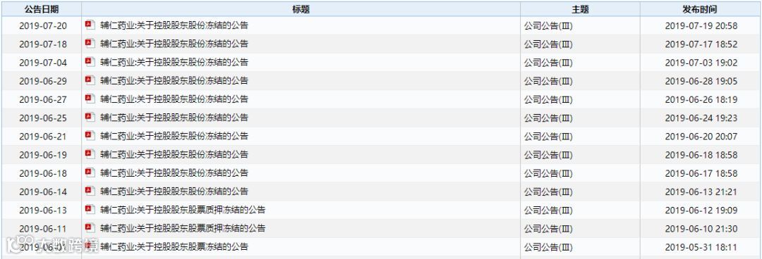 不过,令人奇怪的是,近几个月来这位昔年的富豪官司缠身,自2019年6月份开始,朱文臣所持上市公司股权就被轮候冻结。辅仁药业先后发布了13份大股东股份冻结和轮候冻结的公告,截至目前,其所持有的45%股份,全部被质押或者冻结。