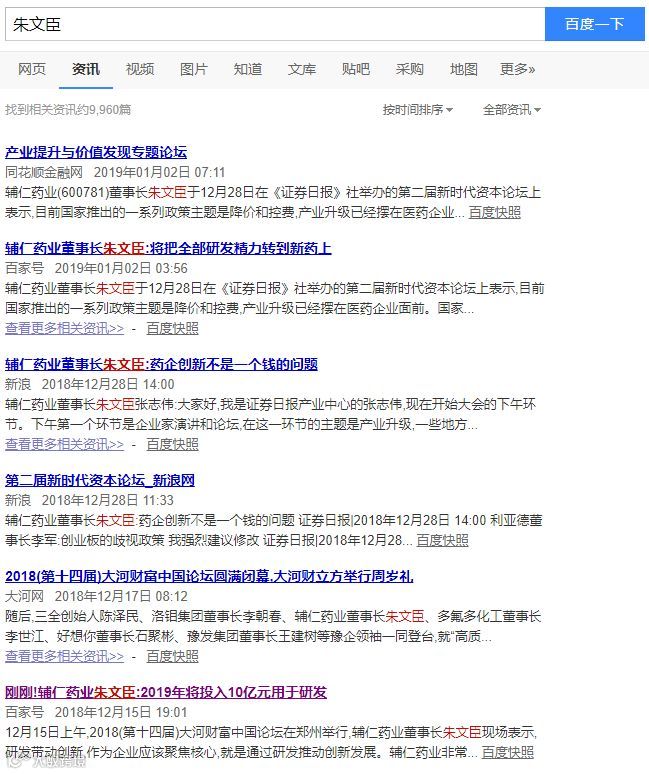 那么,这位前河南首富究竟发生了什么事?从目前的公开信息,很难查到确切的资料。去年底的时候,朱文臣曾在2018(第十四届)大河财富中国论坛上露面。他表示,要用研发带动创新,辅仁药业非常注重新药品的研发,目前已经投入了6亿元,明年还将投入10亿。今年1月初,朱亦有露面,但随后就未再见其新闻。