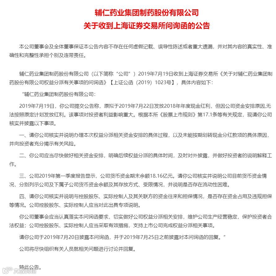 针对辅仁药业拿不出6000万分红款一事,上交所火线问询。