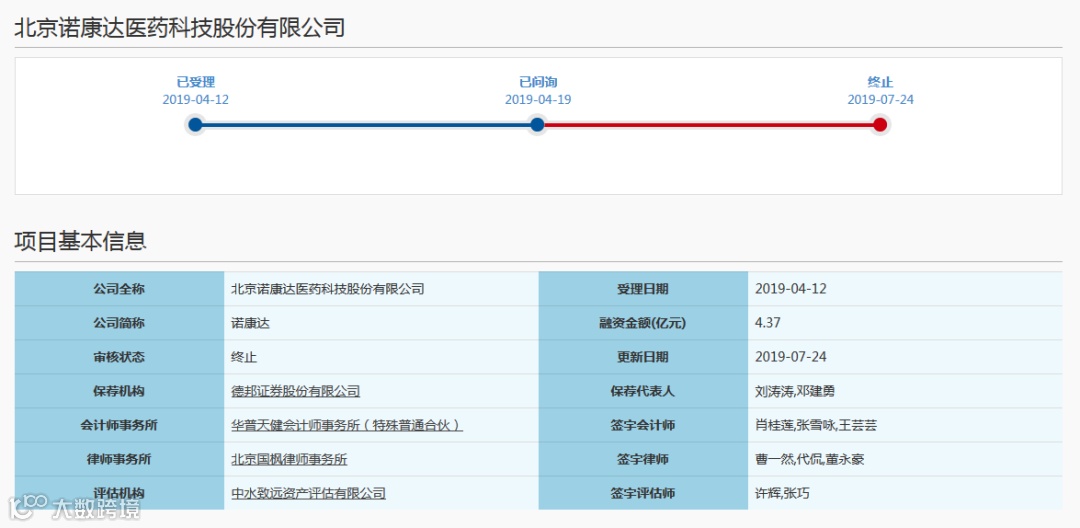 上交所披露数据显示,诺康达保荐券商为德邦证券,受理日期为4月12日,同期申报的航天宏图、天宜上佳、沃尔德均已完成发行上市工作,而诺康达的进度还停留在第一轮问询中,问询时间为4月19日,问询回复披露日期为5月8日。而在7月24日,诺康达的审核状态变更为“终止”。