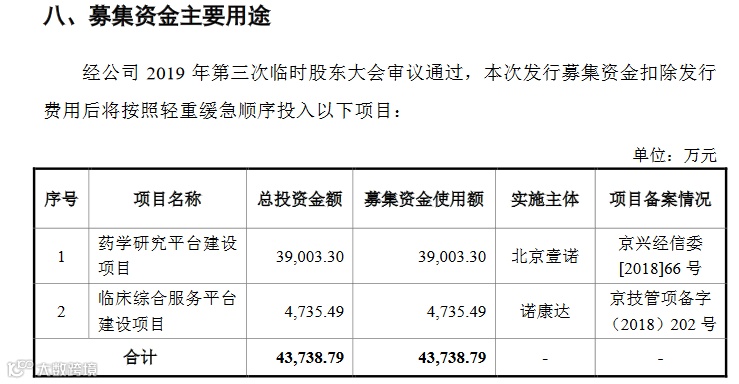 在募集资金方面,此次诺康达拟募集资金为4.37亿元,拟用于药物研究平台建设项目和临床综合服务平台建设项目,投资金额分别为3.90亿元、0.47亿元。