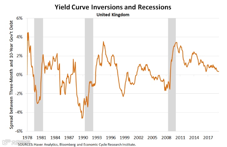 如下图,英国3个月期和10年期限的国债收益率曲线接近倒挂。