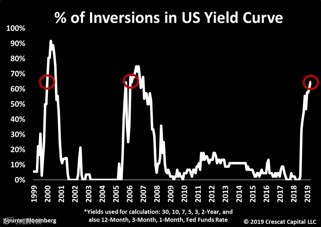 目前,除了3 个月和10年期国债收益率出现倒挂之外,有65%的国债收益率曲线,也已经出现了倒挂情况。这种局面都曾经出现在2006年和1999年的两场世界级的经济危机当中。