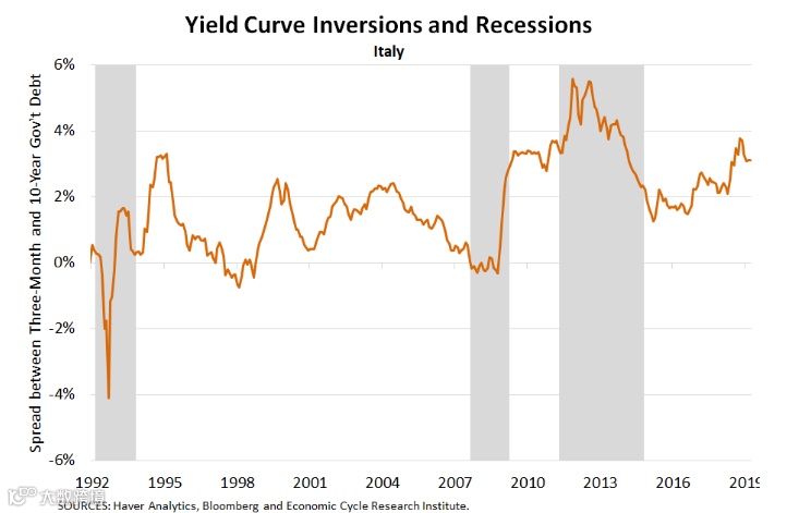 如下图,意大利3个月期和10年期限的国债收益率曲线出现下滑。