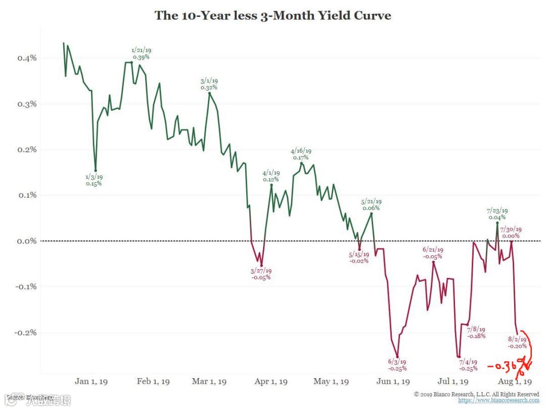 美国10 年国债收益率代表长端利率,3 个月国债收益率代表短端利率。8月6日,3 个月和10年期国债收益率倒挂一度达到了36个基点。