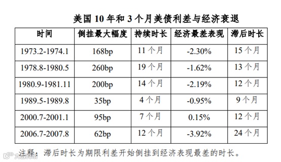 即使在倒挂幅度最小的 1989 年 6 月至 1989 年 12 月,曲线倒挂最大幅度仅为 18基点,美国经济依然在 9 个月之后步入了衰退。