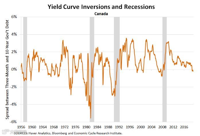 如下图,加拿大3个月期和10年期限的国债收益率曲线已经倒挂。