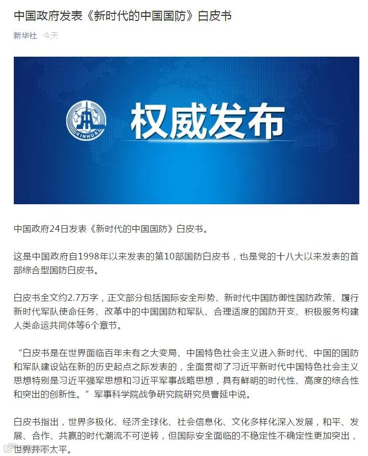7月24日,国务院新闻办发布《新时代的中国国防》白皮书《新时代的中国国防》白皮书发布,首次提出多项新内容,本次国防白皮书为1998年以来的第十版,为“十八大”以来的首次综合型国防白皮书。