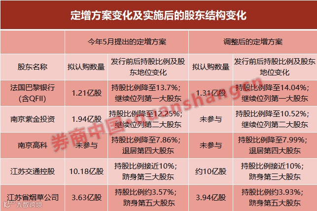 与被否决的定增方案相比,虽然计划募资规模、发行数量均与此前一致,但发行对象的数量及名单有所变化:太平人寿、凤凰集团、南京高科均退出原定增方案,取而代之的是法巴银行、江苏烟草。