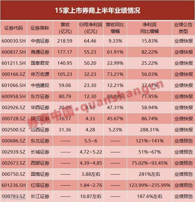 就归属于母公司净利润来看,已公布预告的15家上市券商中,中信证券、海通证券、国泰君安上半年盈利超50亿元,申万宏源上半年归属于母公司净利润32亿,中信建投23亿,东方证券归属于母公司净利润12亿。