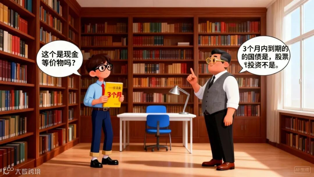 现金等价物:3 个月内到期的国债属于,股票投资不属于(价值变动不确定)。