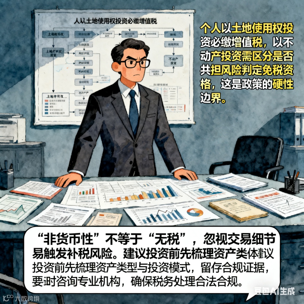 土地使用权投资无此豁免,无论是否共担风险,均需按转让无形资产缴税。