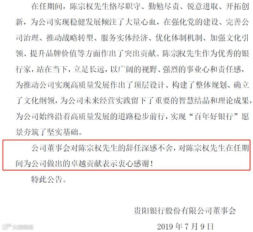 “陈宗权为公司改革发展作出了重要贡献……,公司董事会对陈宗权的辞任深感不舍,对陈宗权在任期间为公司做出的卓越贡献表示衷心感谢!”贵阳银行在公告中对陈宗权的贡献不乏赞美之词。