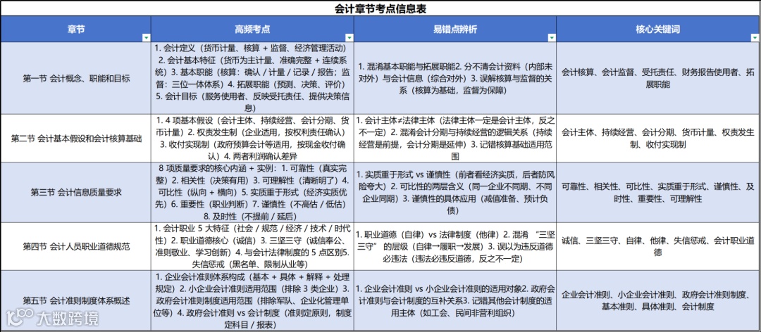 对比记忆法:易错点均为易混淆概念,采用 “A vs B” 对比(如权责发生制 vs 收付实现制、职业道德 vs 法律制度),强化区分。