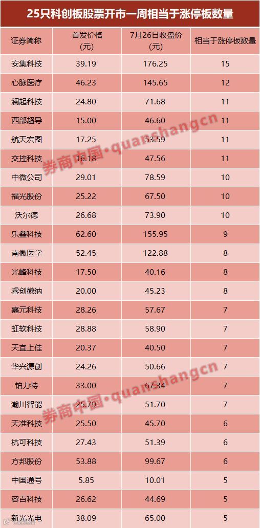 这五日的上涨,相当于主板其他板块新股上市多少个涨停板呢?券商中国记者计算发现,在不设涨跌幅限制情况下,首批科创板25只股票的涨幅相较A股其他板块新股来说,一字涨停并不算多。
