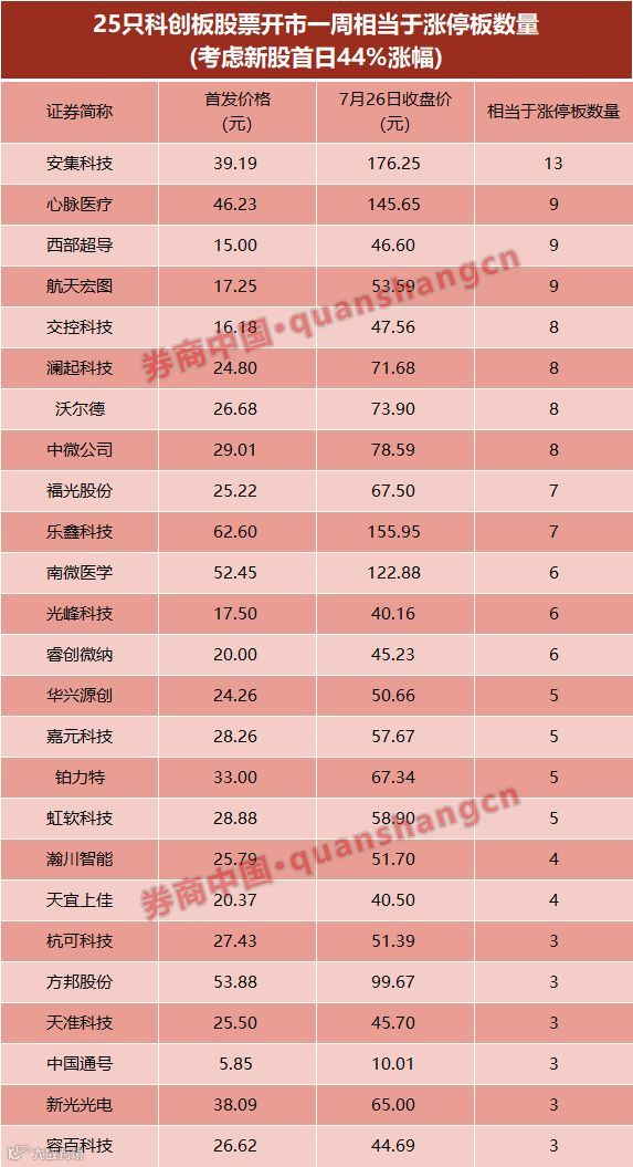 若考虑新股首日44%涨幅,安集科技相当于上市后连续拿下了13个一字板,心脉医疗、西部超导、航天宏图则连续拿下9个一字板,交控科技、澜起科技、沃尔德、中微公司连续拿下8个一字板。
