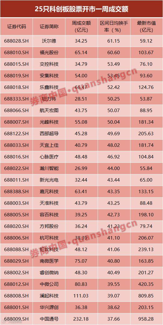 首周25只个股日均换手率46.10%,平均每天有近半数筹码换手;在5天中,所有科创板股累计换手率均超过100%。