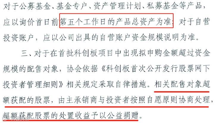 三是,对于在首批科创板项目中出现拟申购金额超过资金规模的配售对象,协会依据《科创板首次公开发行股票网下投资者管理细则》相关规定采取自律措施。相关配售对象超额获配的股票,由主承销商与投资者按照自愿原则协商处理,超额获赔股票的处置收益予以公益捐赠。
