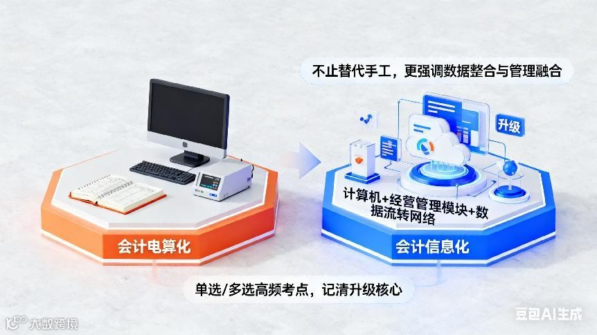 易错易混点辨析会计信息化 vs 会计电算化:会计信息化是电算化的升级,更强调数据整合、与经营管理融合,而非单纯的计算机替代手工记账。电子凭证使用:以纸质打印件入账时,必须同时保存电子原始凭证,不可仅存纸质件。