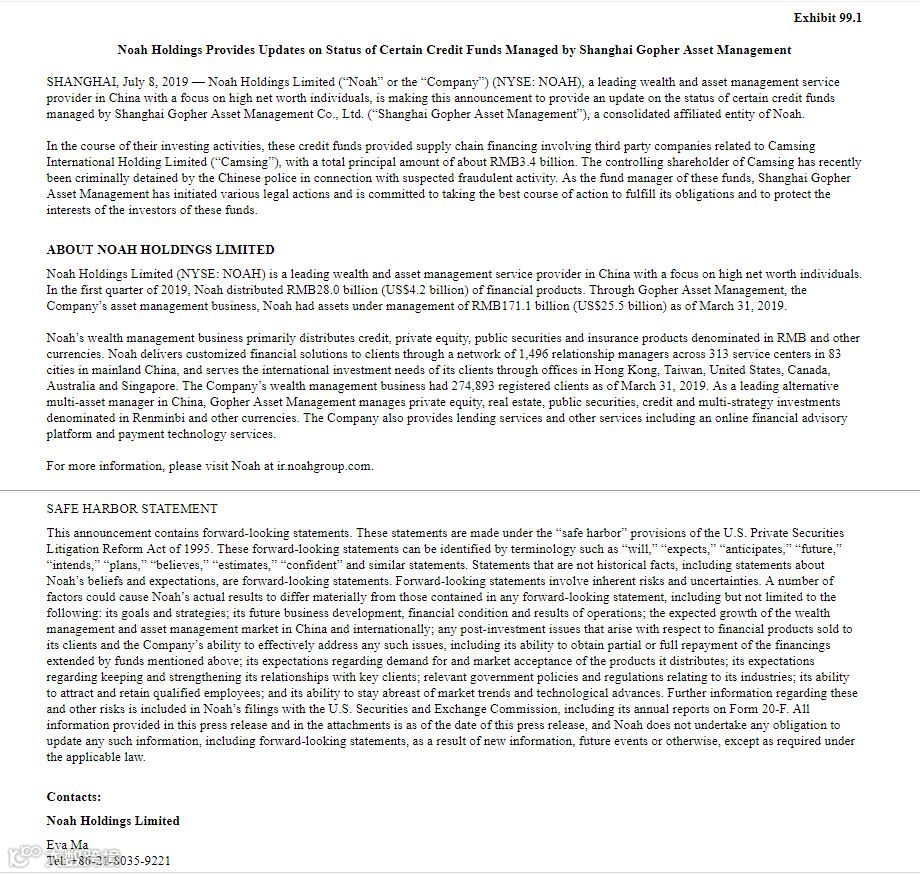 事后,诺亚财富方面对外界表示,关于诺亚旗下上海歌斐资产管理的创世核心企业私募基金延期事件,公司已于7月8日19点(北京时间)发布官方声明,发现该项目风险因素后,立即启动了对存续期内其它产品的深度排查,截至目前并未发现同类问题(截至 2019年第一季度,歌斐管理基金总额为1711亿,产品数量共计800余支)。诺亚财富将积极配合警方调查,尽全力推进事件解决。