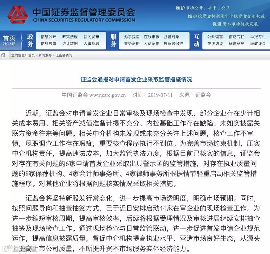 为完善市场约束机制,压实中介机构责任,提高违法成本,加大监管执法力度,根据目前已核实的信息,证监会对存在有关问题的6家申请首发企业采取出具警示函的监管措施。