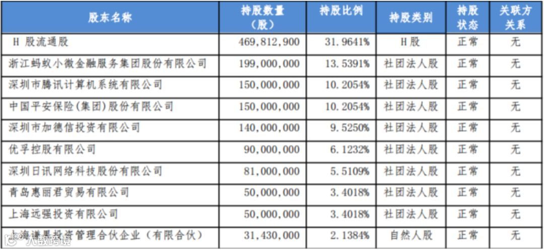 众安保险前十大股东持股情况(截至2019年一季末)