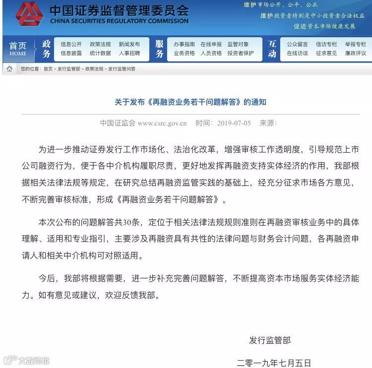 7月5日,证监会发布《再融资业务若干问题解答》。