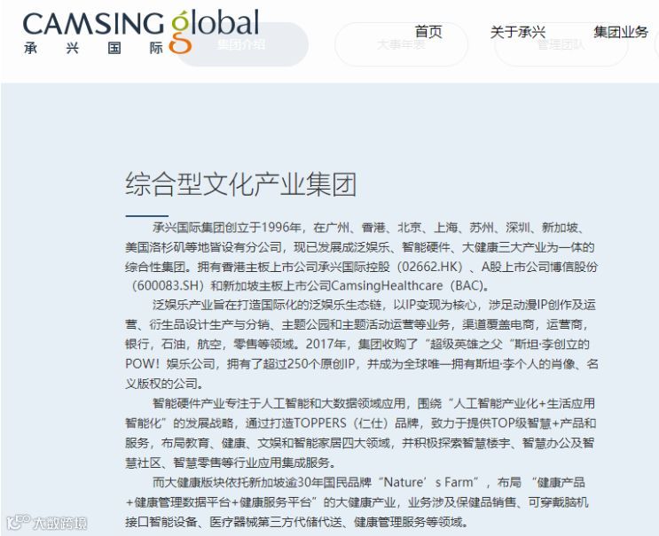 也就是说,苏州晟隽营销管理有限公司应该与承兴国际集团有关。那么,承兴国际集团又是一个怎样的公司呢?据其官网介绍,承兴国际集团创立于1996年,在广州、香港、北京、上海、苏州、深圳、新加坡、美国洛杉矶等地皆设有分公司,现已发展成泛娱乐、智能硬件、大健康三大产业为一体的综合性集团。拥有香港主板上市公司承兴国际控股(02662.HK)、A股上市公司博信股份(600083.SH)和新加坡主板上市公司CamsingHealthcare(BAC)。该集团的业务主要分为泛娱乐产业、智能硬件产业和大健康板块。
