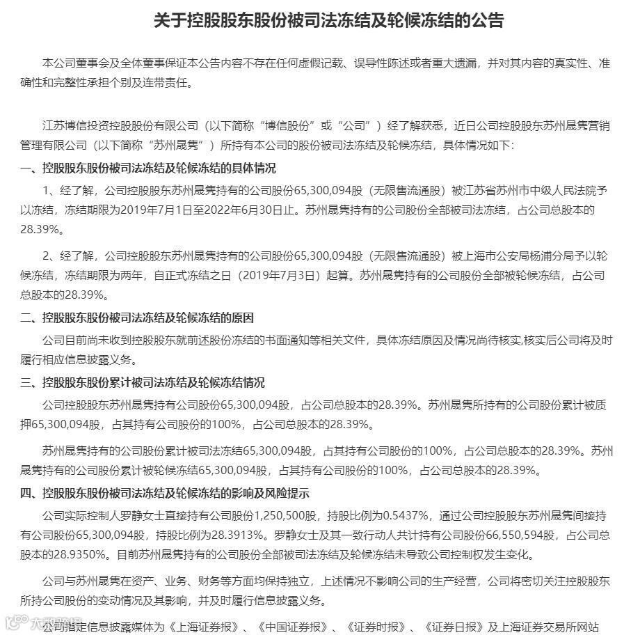 从公开信息来看,目前还很难得到确切的消息。有业内人士说,可能涉及P2P项目,亦有一些其他说法。而从博信股份的公告来看,苏州晟隽持有的公司股份65,300,094股(无限售流通股)已被江苏省苏州市中级人民法院和上海市公安局杨浦分局予以轮候冻结。这意味着,罗静应该是涉嫌刑事犯罪。